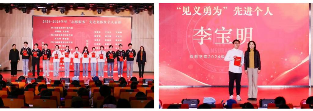 第三篇章聚焦红色传承与时代担当。武术协会的《武承薪火丹心护邦》拳脚生风、招式凌厉,尽显少年锋芒;肖畅、赵晟宇等同学的说唱《华夏》韵脚利落、热血澎湃,唱响华夏荣光;李世龙、高蕾两位老师与精算2501、2503班47名同学的朗诵《沉默的荣耀-致吴石与朱枫》声入人心,致敬无名英雄的赤诚担当;杨文生老师演唱的《我们的中国梦》旋律昂扬,凝聚奋进力量。志愿服务类表彰环节,获奖学子以奉献为笔、担当为墨,用点滴行动诠释青年责任。