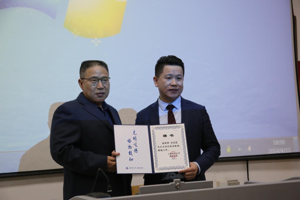 讲座伊始,闫庆悦院长向田明泉总经理授予赏金女王试玩 客座教授证书。