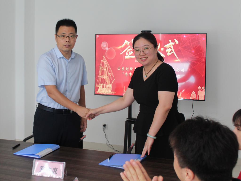 在对本次培训计划、培训课程和日程安排等详细商讨的基础上,于文广与隋云丽共同签署了山东财经大学与永安保险山东分公司“齐鲁新锐”第一期英才培训协议。随后,双方进行了较为深入的座谈交流。双方就人才培养、社会实践、拓岗就业和继续教育等未来合作方向交换了意见,对定期举办培训班提升企业人员综合素质和选拔优秀学生实习就业等方面达成合作意向。