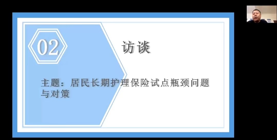 7月24日上午,调研团队通过视频会议的形式与黄墩镇护理中心韩梁主任、护理中心孔慧医生和高林护理员就居民长期护理保险试点瓶颈问题与对策开展了访谈会。通过此次访谈调研团队了解到了居民长期护理保险定点护理机构申请的流程,黄墩镇敬老院的护理人员构成和配套设施完善程度等情况。同时团队也了解到了一些关于居民长期护理保险试点中存在的问题,例如定点护理机构所签订的服务协议的有效期是I年时间,协议有效期可以适当延长;同时在配套设施智能化方面,定点服务机构也有一定的需求;居民长期护理保险的报销比例可以再适当提高一点,护理项目例如针灸等,护理方式等方面需要建立更加详细统一的标准。