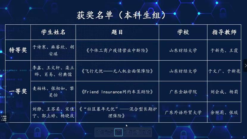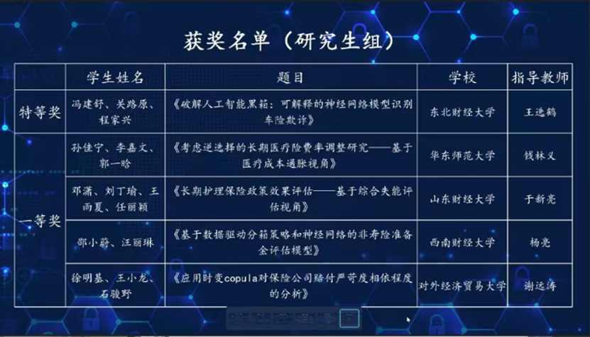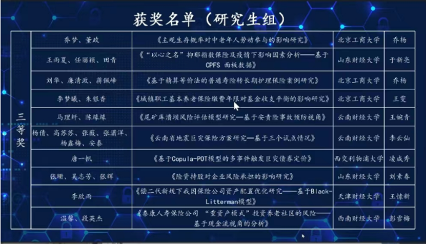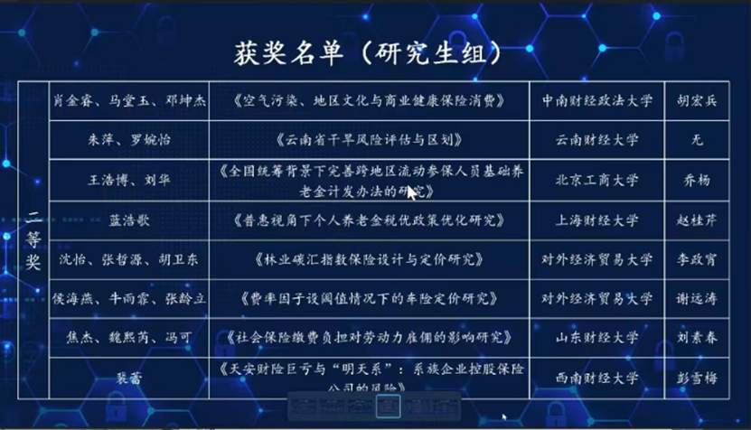 此外,赏金女王模拟器 两个本科生队、四个研究生团队的竞赛作品分别入选本科生保险产品设计竞赛和研究生风险管理案例竞赛环节,最终斩获佳绩,共获特等奖一项、一等奖两项、二等奖一项和三等奖两项。其中,本科生保险产品设计竞赛中,于诗寒、麻睿欣、胡安琪的参赛作品《个体工商户疫情营业中断险》(指导老师:于新亮、王霞)荣获特等奖,李鑫、王文轩、栾立晔、肖易、付典儒的参赛作品《飞行无忧——无人机全面保障险》(指导老师:于文广、于新亮)荣获一等奖;研究生风险管理案例竞赛中,邓潇、刘丁瑜、王雨夏、任丽颖的参赛作品《长期护理保险政策效果评估——基于综合失能评估视角》(指导老师:于新亮)荣获一等奖,焦杰、魏熙芮、冯可的参赛作品《社会保险缴费负担对劳动力展佣的影响研究》(指导老师:刘素春)荣获二等奖,王雨夏、任丽颖、田青的参赛作品《“以心之名”抑郁指数保险及疫情下影响因素分析——CPFS面板数据》(指导老师:于新亮)和张珊、吴志芳、张辉的参赛作品《险资持股对企业风险承担的影响研究》(指导老师:刘素春)荣获三等奖。