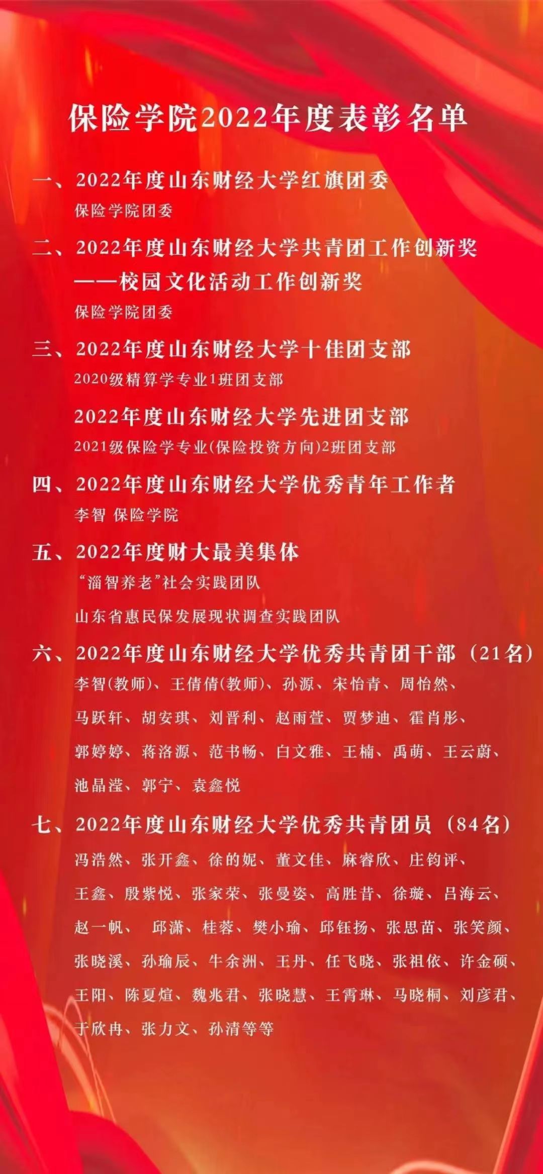 近日,2022年度山东财经大学“五四评优”结果公布,赏金女王模拟器 共青团工作荣获多项荣誉表彰。学院团委荣获“山东财经大学红旗团委”称号,这是自2019年以来赏金女王模拟器 连续第四次获此殊荣。此外,赏金女王模拟器 团委以第一名的成绩荣获“校园文化活动工作创新奖”荣誉表彰,“淄智养老”社会实践团队和山东省惠民保发展现状调查实践团队荣获“财大最美集体”称号;2020级精算学专业1班团支部荣获“山东财经大学十佳团支部”称号,2021级保险学专业(保险投资方向)2班团支部荣获“山东财经大学先进团支部”称号;1名教师荣获“山东财经大学优秀青年工作者”称号,2名教师和19名同学荣获“山东财经大学优秀共青团干部”称号,84名同学荣获“山东财经大学优秀共青团员”称号。
