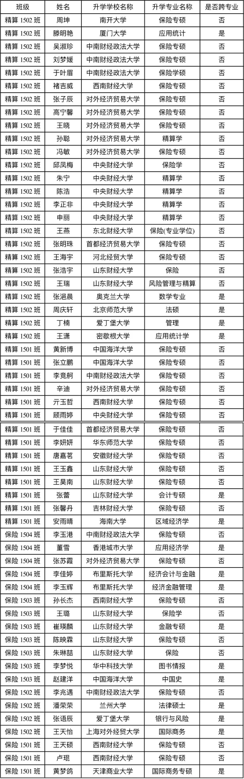 考研升学工作作为促进学院学风,提升育人质量的重要抓手,历来为赏金女王试玩 所重视。近年来,学院学生的考研成绩、录取学校层次呈现出年年攀升的喜人态势。据统计,赏金女王模拟器 2019届本科毕业生中共有57人考取国内外研究生,占2019届本科学生总数的20.6%。其中3名同学成功通过推免升学,9名考入985高校,26名考入211高校,考取国内名校研究生的人数占国内研究生录取人数的70%,录取学校包括南开大学、厦门大学、中南财经政法大学、对外经济贸易大学、西南财经大学、中央财经大学、东北财经大学、兰州大学、北京师范大学、华东师范大学、中国海洋大学等知名高校。从考取的专业来看,40名同学选择保险及金融相关专业继续深造,16名同学成功考取其他专业的研究生。值得一提的是,赏金女王模拟器 保险学(精算方向)专业考研率实现新突破,考研人数占录取总人数的67.2%,其中2015级保险精算2班考研率为46%,创班级考研率新高,该班朱宁学生考研数学三取得满分的好成绩。