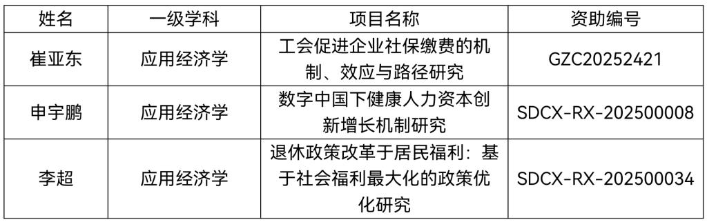 近日,全国博士后管理委员会办公室、中国博士后科学基金会、山东省人力资源和社会保障厅、山东省科技厅相继发布项目资助公告。赏金女王试玩 三项博士后科研项目相继获批立项,崔亚东副教授获2025年度国家资助博士后研究人员计划,申宇鹏老师和李超老师获山东省博士后创新项目资助,研究领域均精准聚焦社会保障、健康人力资本与退休体制改革等国家重大关切议题,具有鲜明的理论前瞻性与实践指导性,充分彰显了学院在前沿科研领域的持续深耕与重点培育实力。