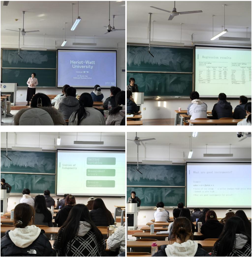 授课期间,高教授围绕计量经济学的核心知识体系,系统讲授了线性回归、多元回归模型、内生性问题的处理方法以及时间序列分析的基本理论与实际应用。课程以收入性别差距的现实数据为切入点,引导学生从具体问题出发,逐步深入模型构建与实证分析全过程。教学过程循序渐进,既有扎实的理论阐释,又紧密结合研究实例,助力学生深化对高级计量方法的理解,提升在保险与金融领域中处理复杂数据的实证能力。