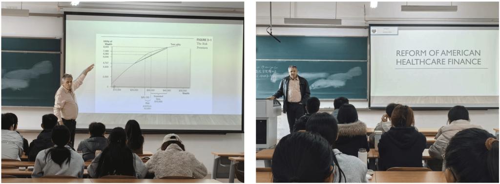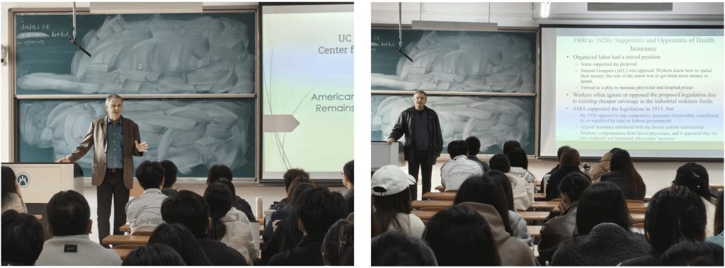 授课期间,Hilsenrath教授围绕美国医疗保险体系的演变、健康保险制度、医疗保险政策及其改革等主题,系统梳理并深入解析了美国医疗系统的结构与发展。在分析美国医疗价格居高不下的原因时,他指出,医疗工作效率较低、价格竞争不完全、市场垄断现象以及新技术成本高昂等是主要因素。在介绍美国健康保险发展历程的课程中,Hilsenrath教授系统梳理了私立医疗保险(如Blue Shield、Blue Cross)与公立医疗保险(如Medicare、Medicaid)的发展脉络,并阐释了不同类型保险之间的区别。此外,他还讲解了健康保险的定价原理、影响保险需求的关键因素,以及预期风险与损失的核心影响因子。最后,Hilsenrath教授从健康保险的税收政策角度出发,深入分析了美国的医疗改革,并分享了自己的见解。Hilsenrath教授注重课堂互动与学生反馈,综合运用提问引导与实时答疑等多种方式,及时把握学生的学习状态,有效调动了学生的课堂参与积极性。整体课堂氛围活跃融洽,师生互动深入且富有成效。
