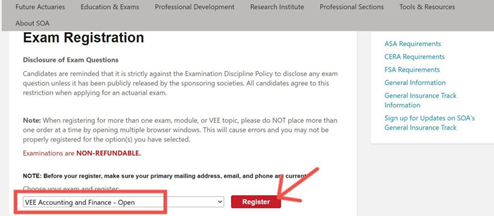 1.首先登陆个人SOA账号,将光标移到“Education&Exams”栏下的registration并点击即可进入科目选择页面,选择“VEE Accounting and Finance-Open”,再点击“Register”即可。