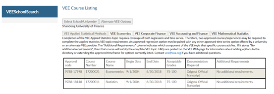 山东财经大学是北美精算师协会(SOA)所认证的UCAP-AC高校,具有VEE课程的抵免资格。VEE认证课程,全称 Validation by Educational Experience, 是ASA 必修课程。VEE包括三门课程: